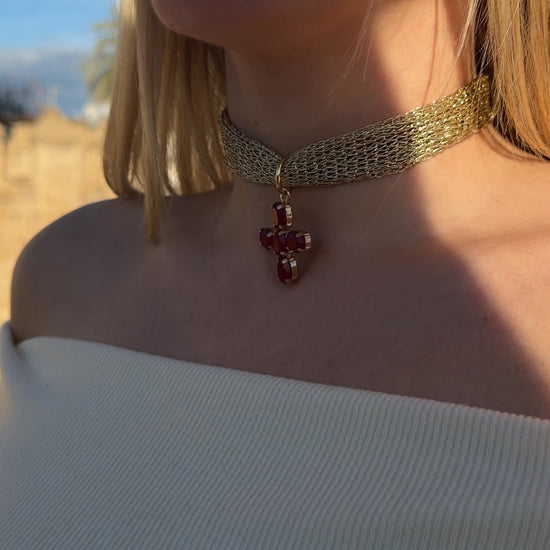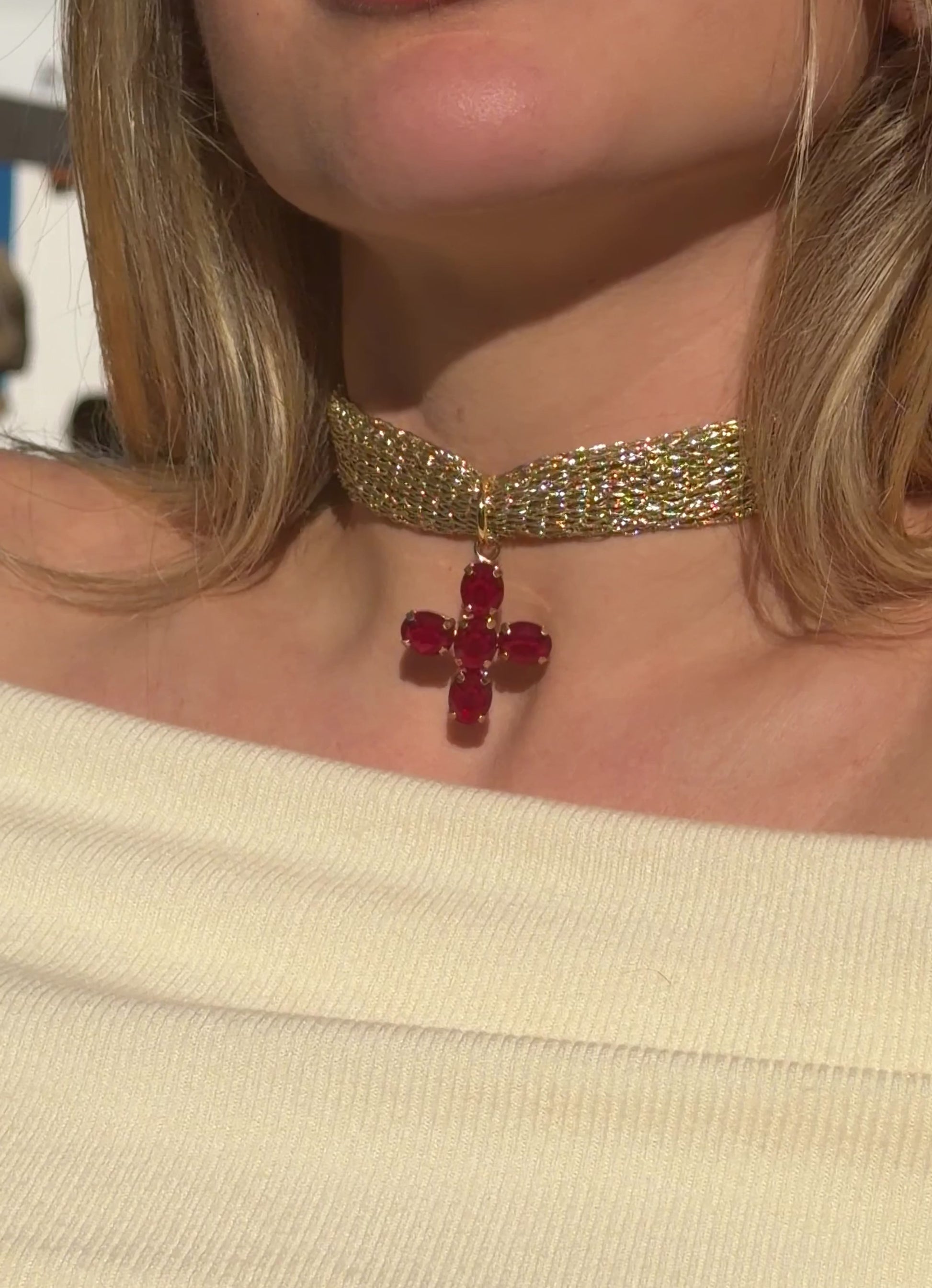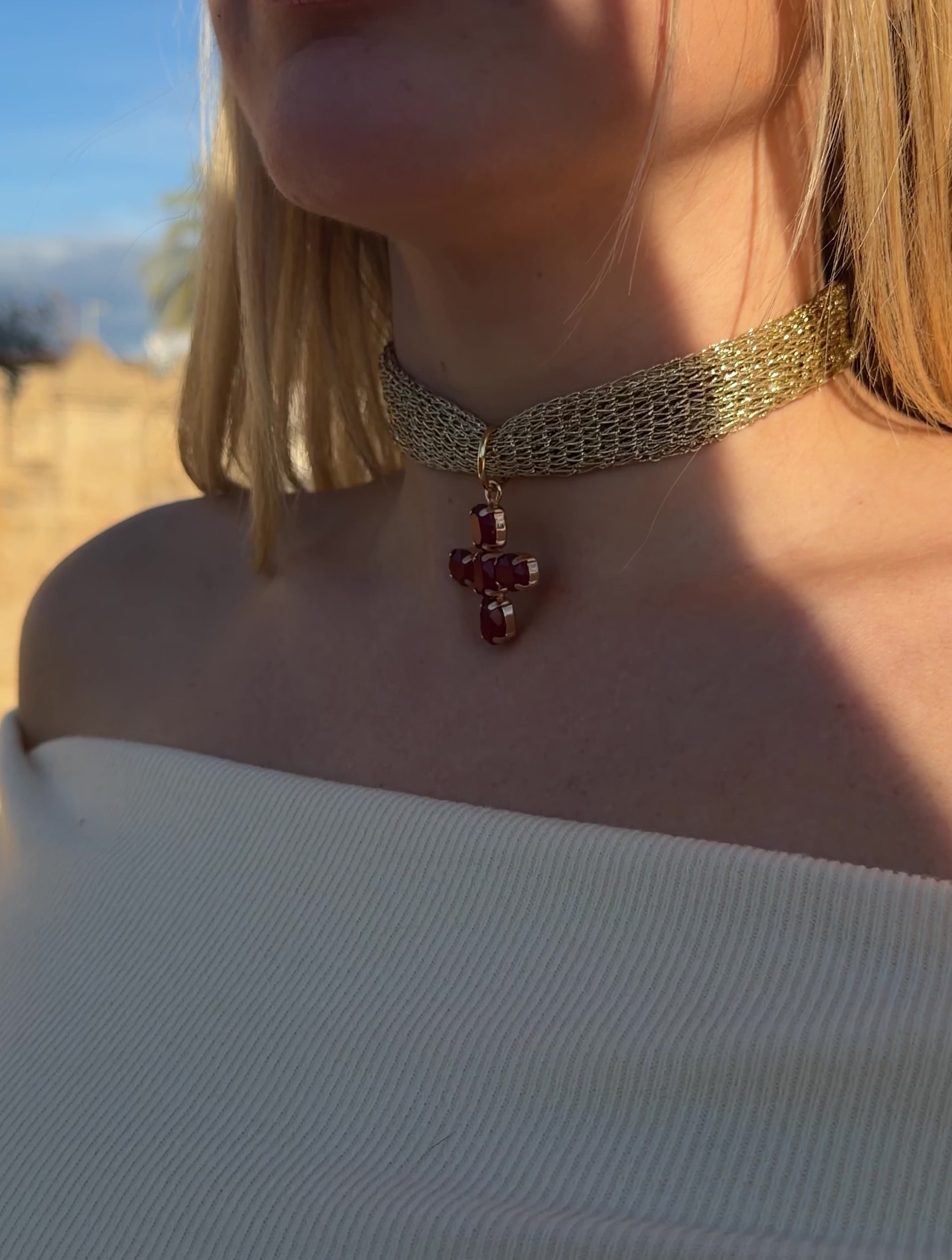 Chocker de malla dorada con colgante en forma de cruz burdeos.