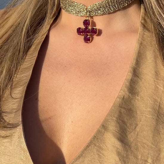 Chocker de malla dorada con colgante en forma de cruz verde burdeos.
