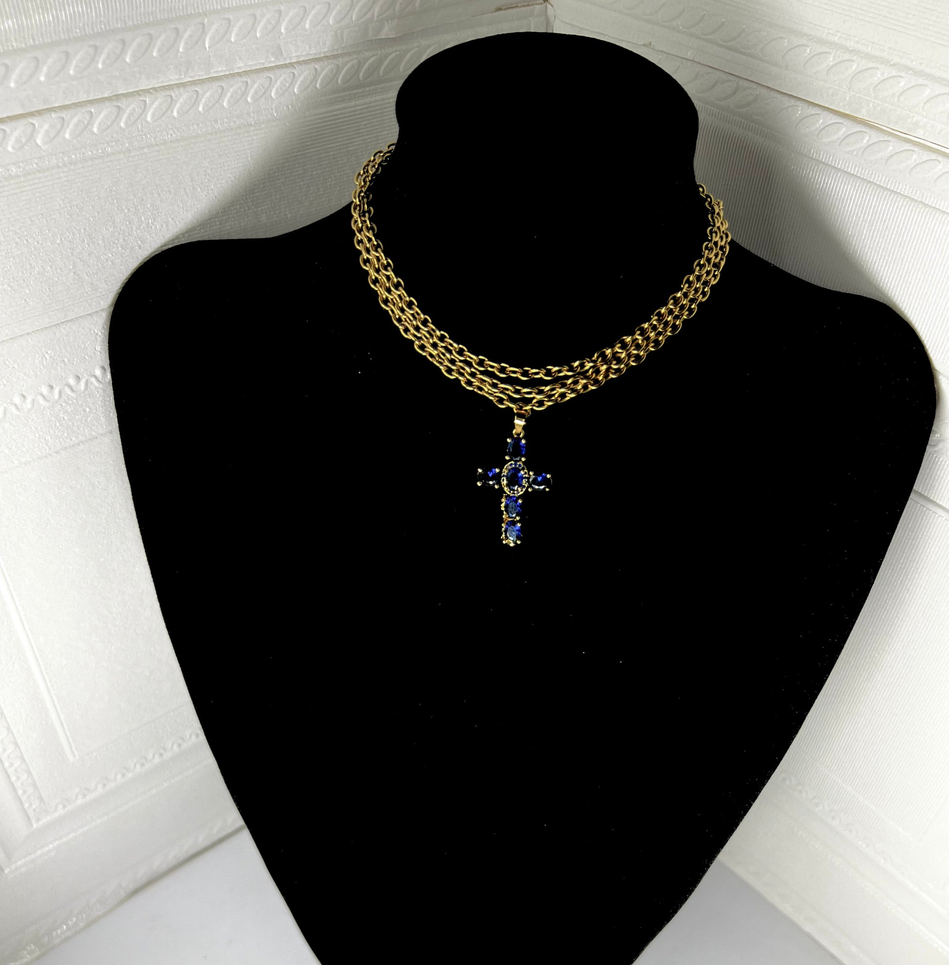Gargantilla diseñada y hecha a mano, de acero inoxidable, con triple cadena dorada y cruz en azul oscuro.
