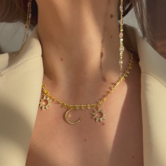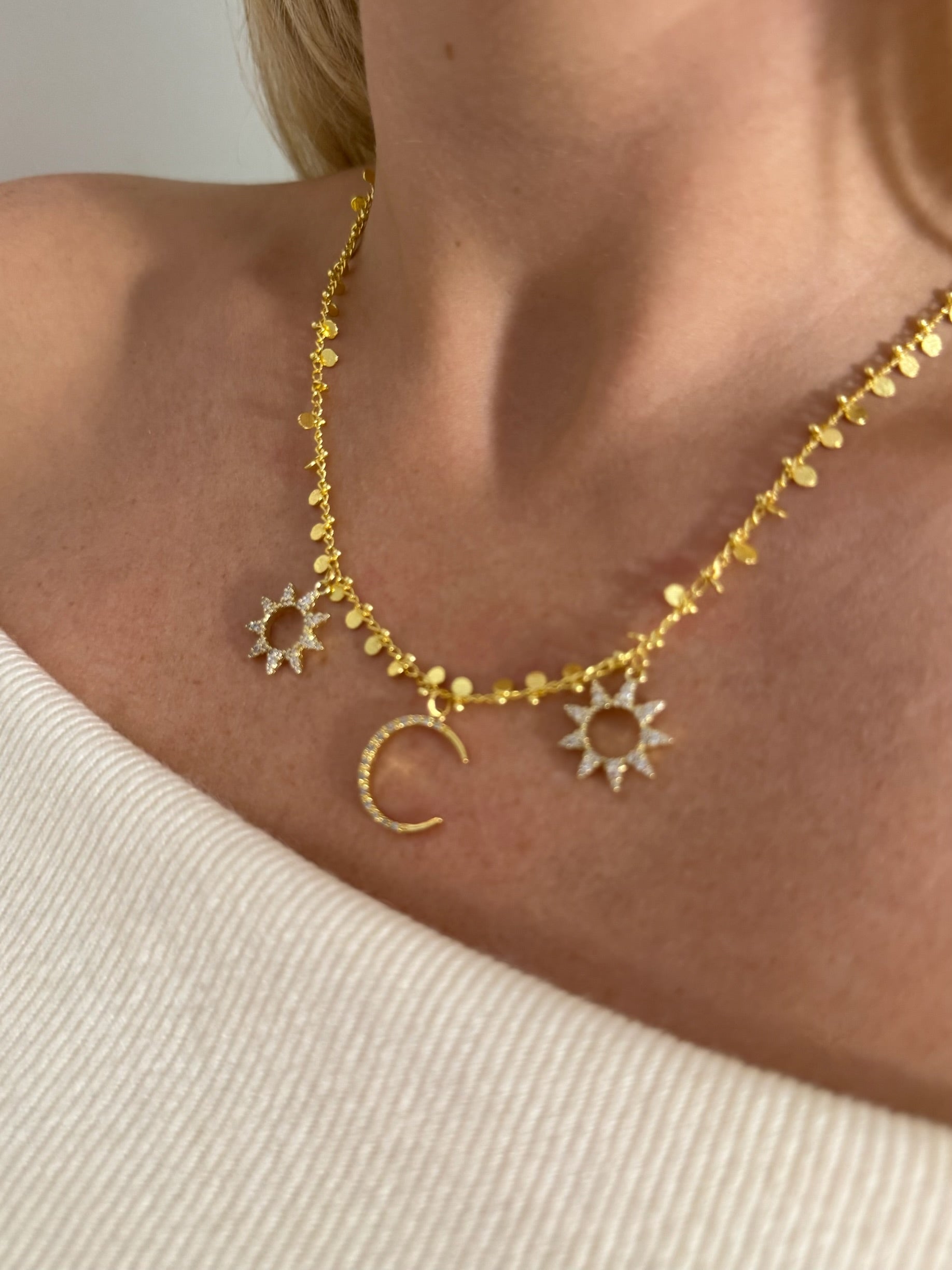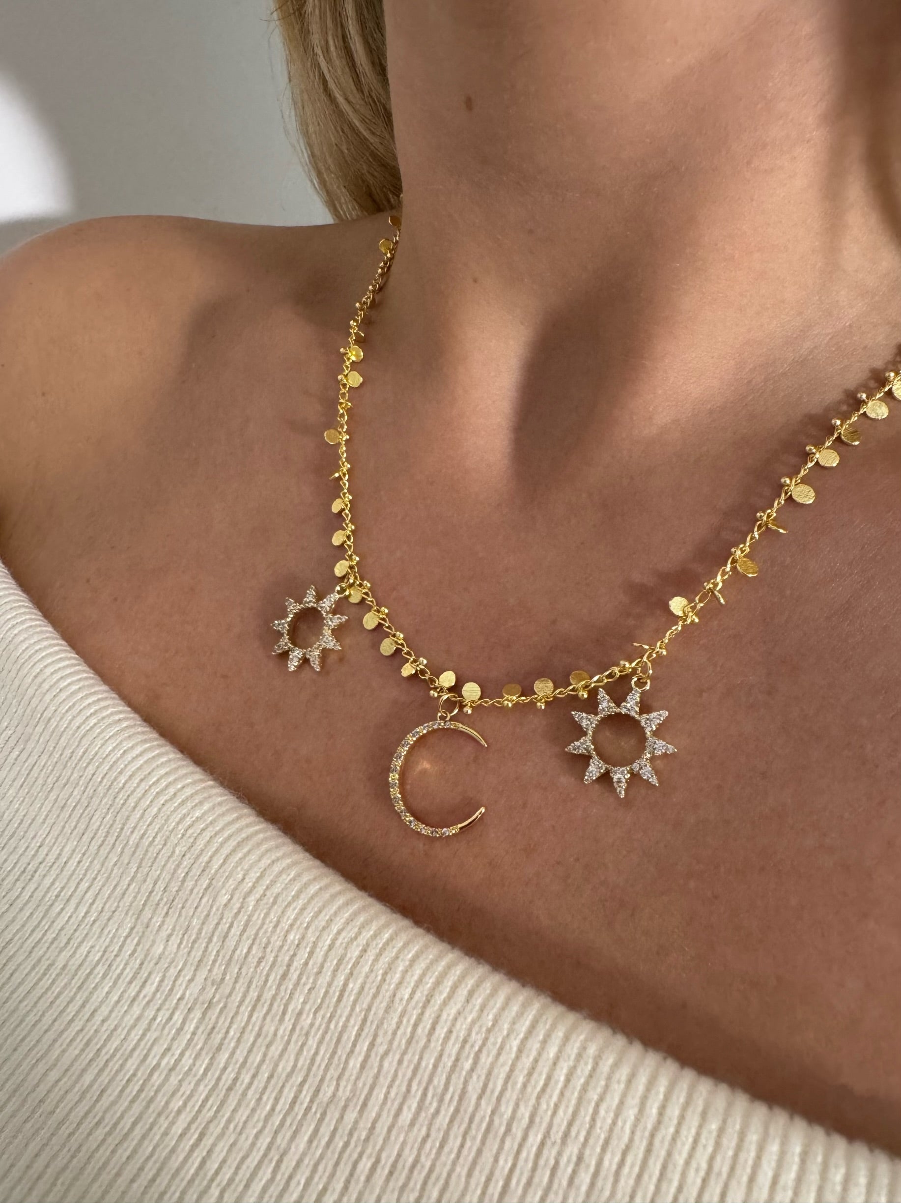 Nuestro Collar Cielo, con charms de sol, luna y estrellas, refleja luz y energía. Aportando ese brillo especial y único a tu escote.