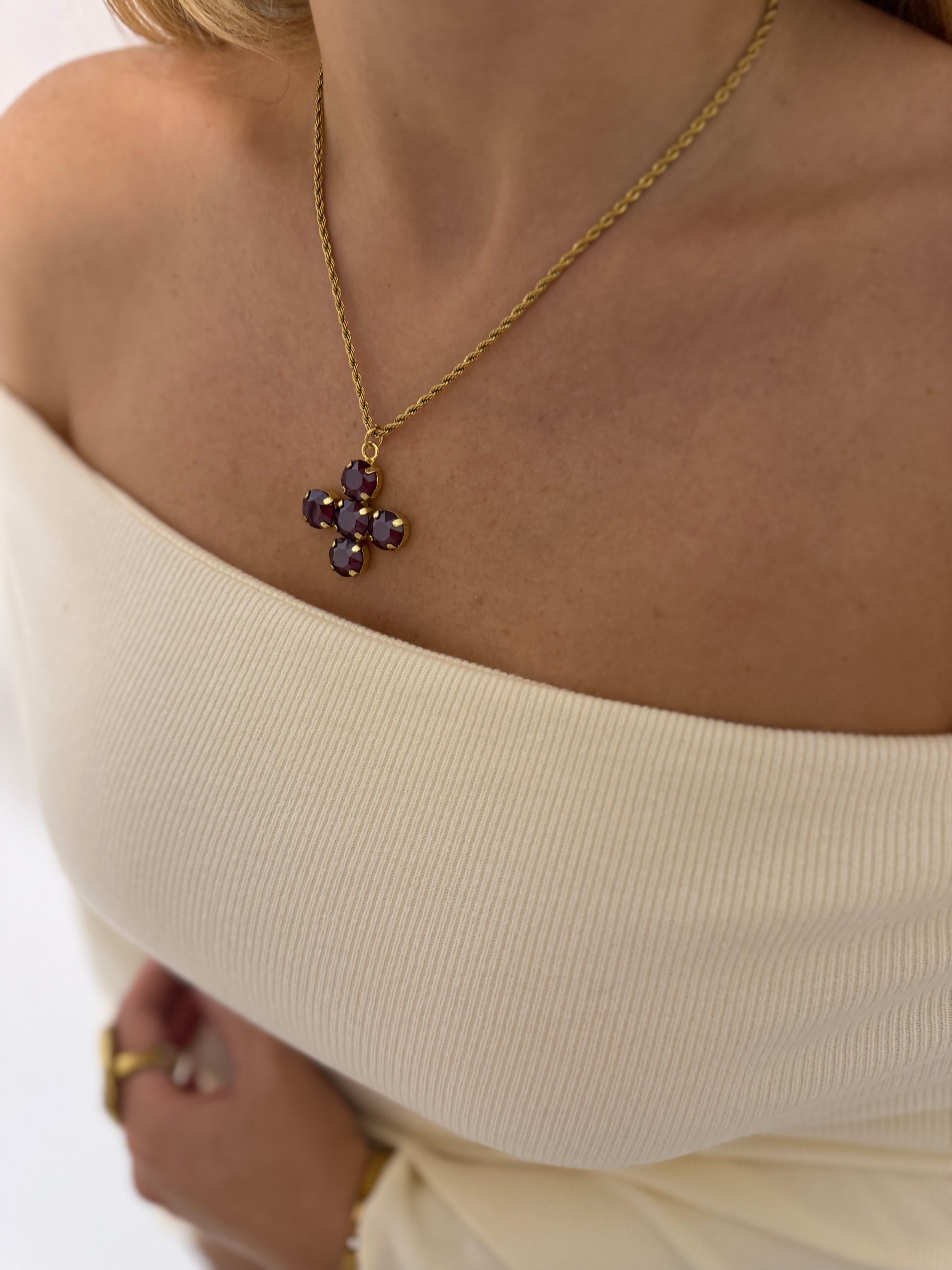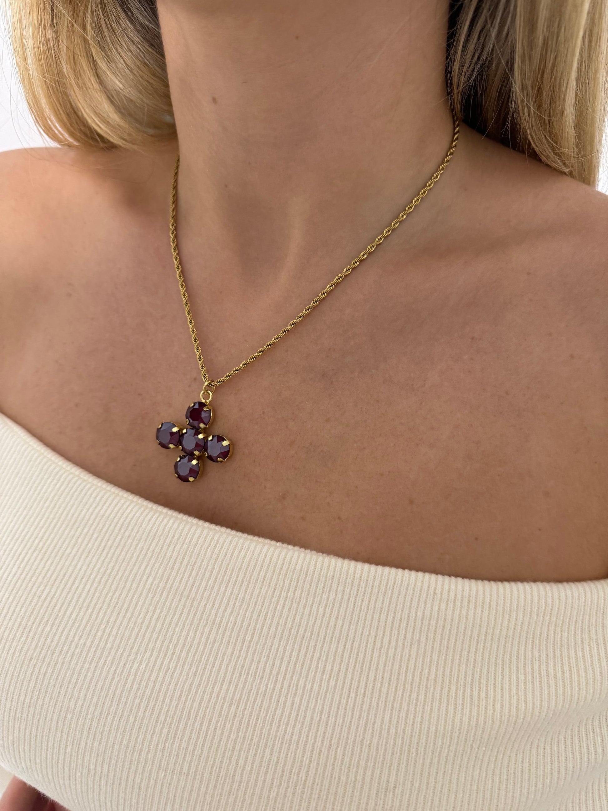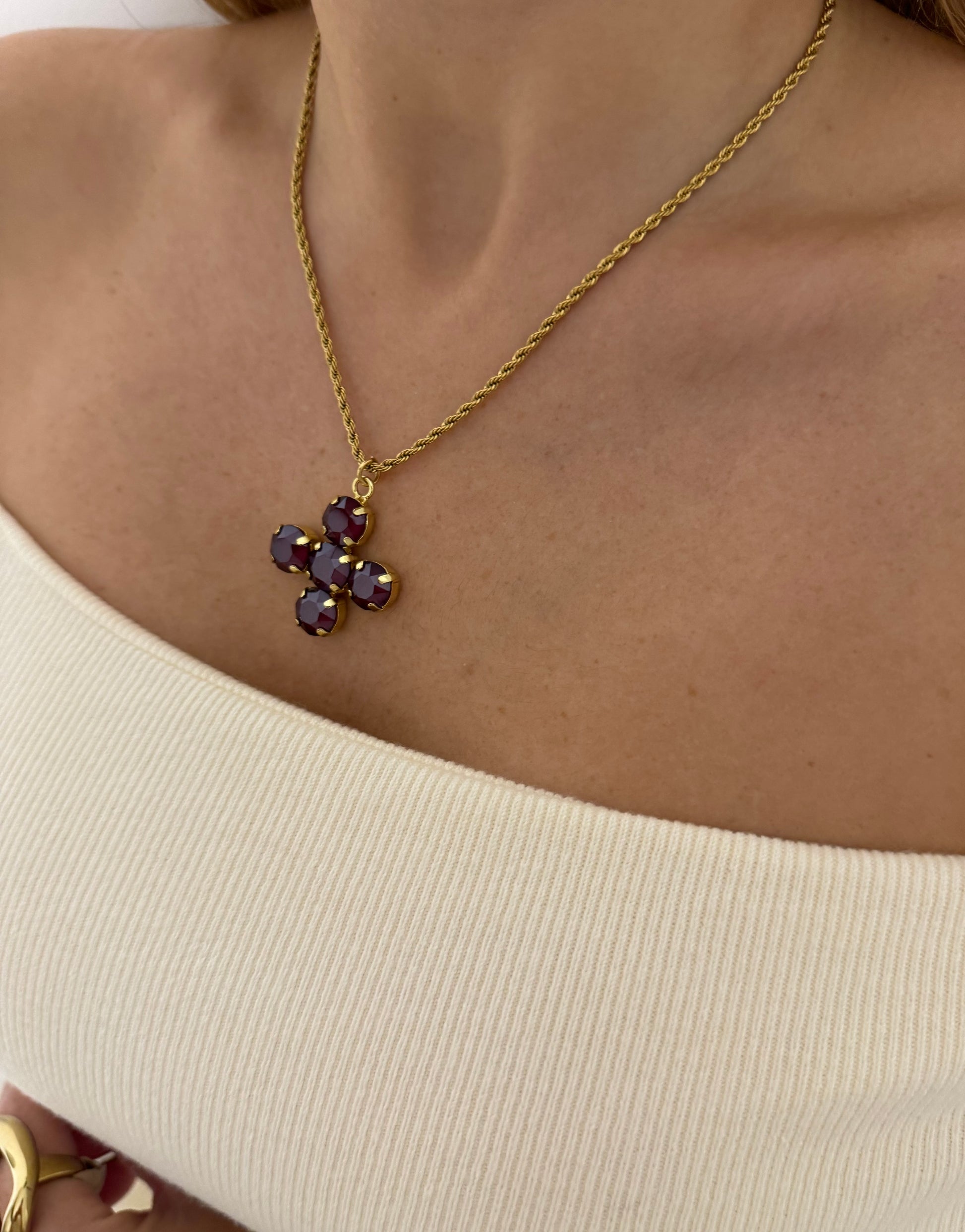 Collar dorado con cadena fina trenzada y colgante en forma de cruz de piedras burdeos.