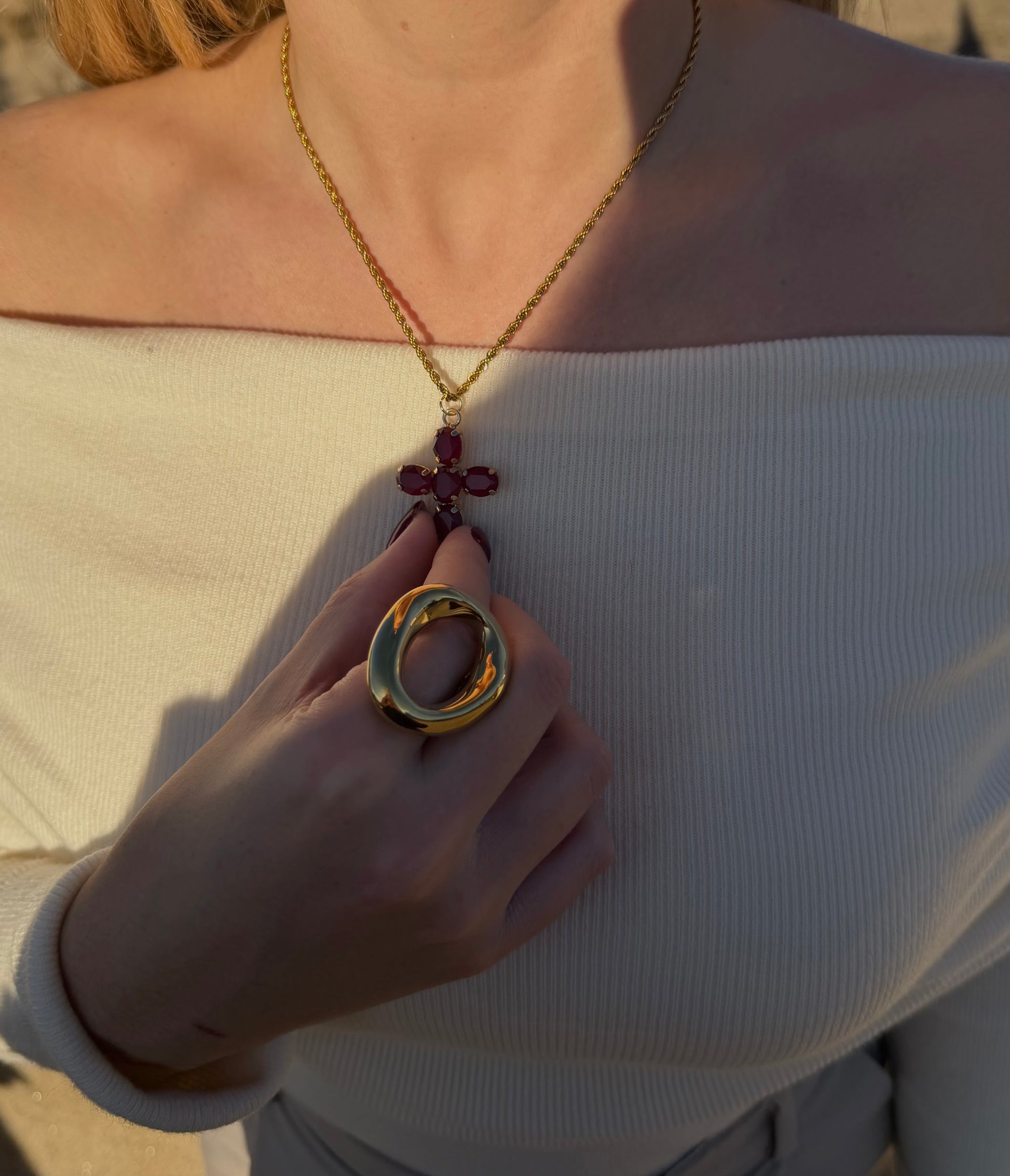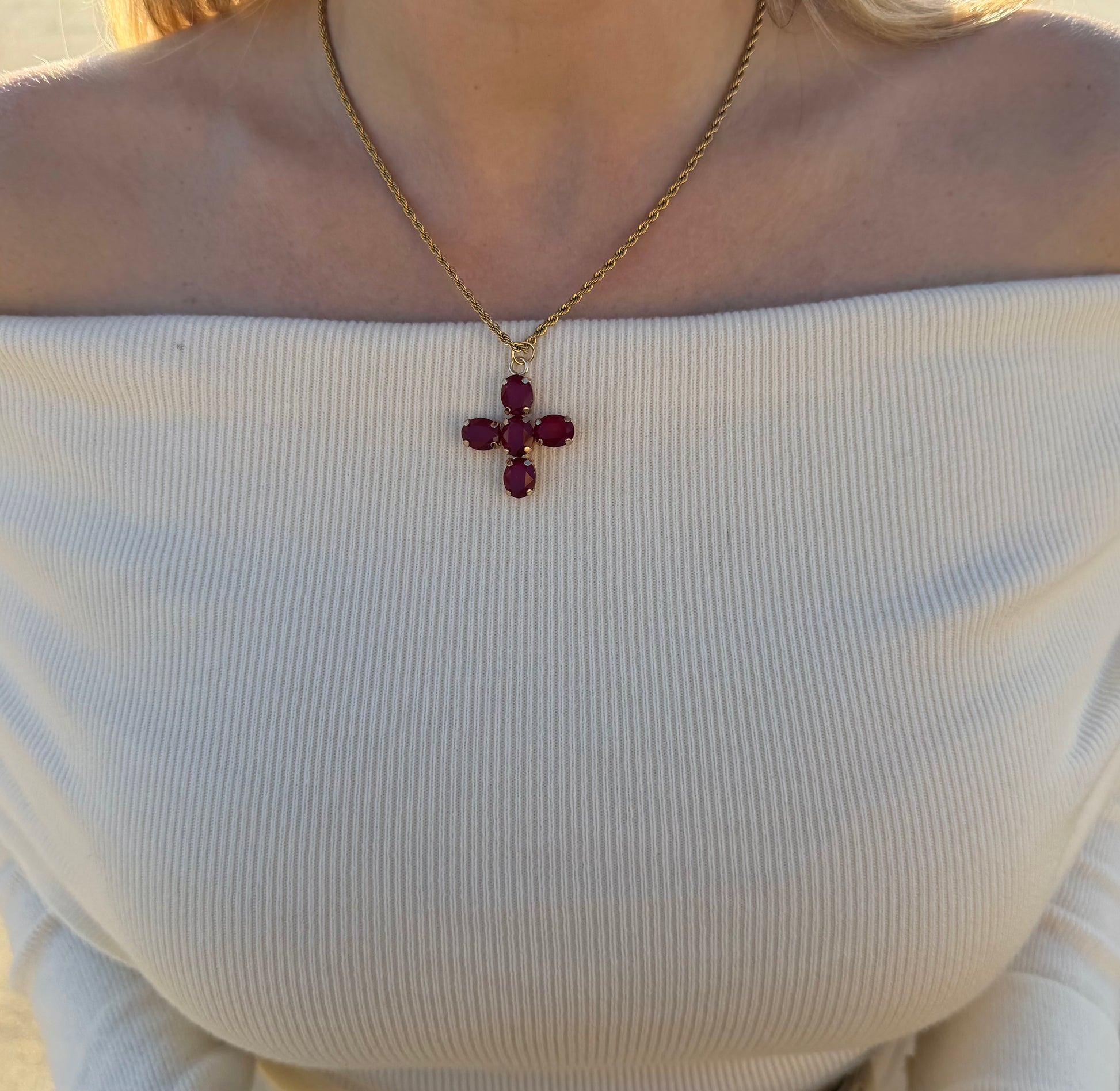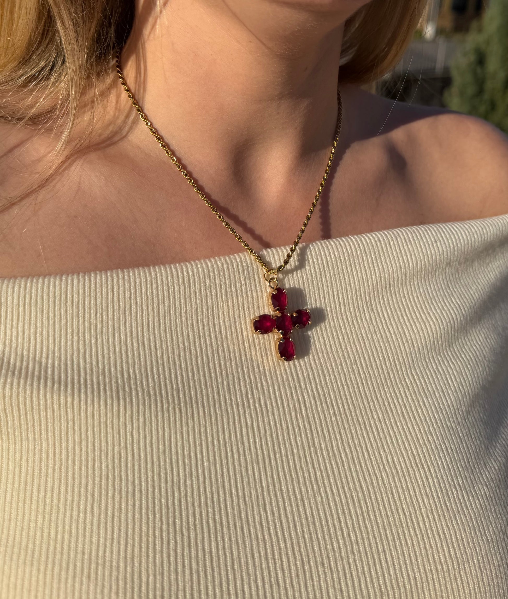 Collar dorado con cadena fina trenzada y colgante en forma de cruz de piedras burdeos.