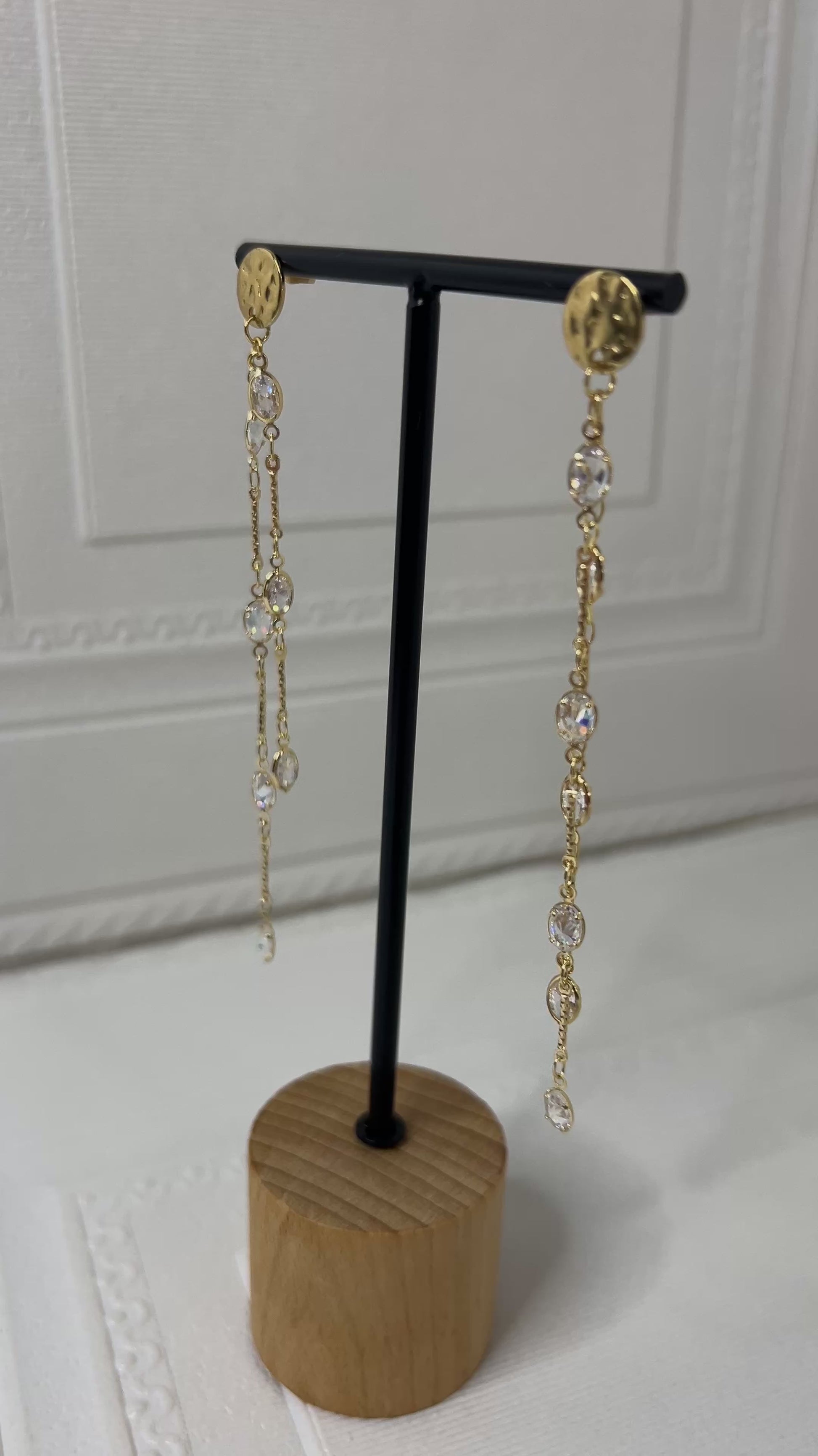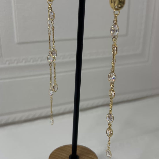 Pendientes dorados con piedras blancas que imitan el cristal y doble cadena que aporta movimiento y brillo.
