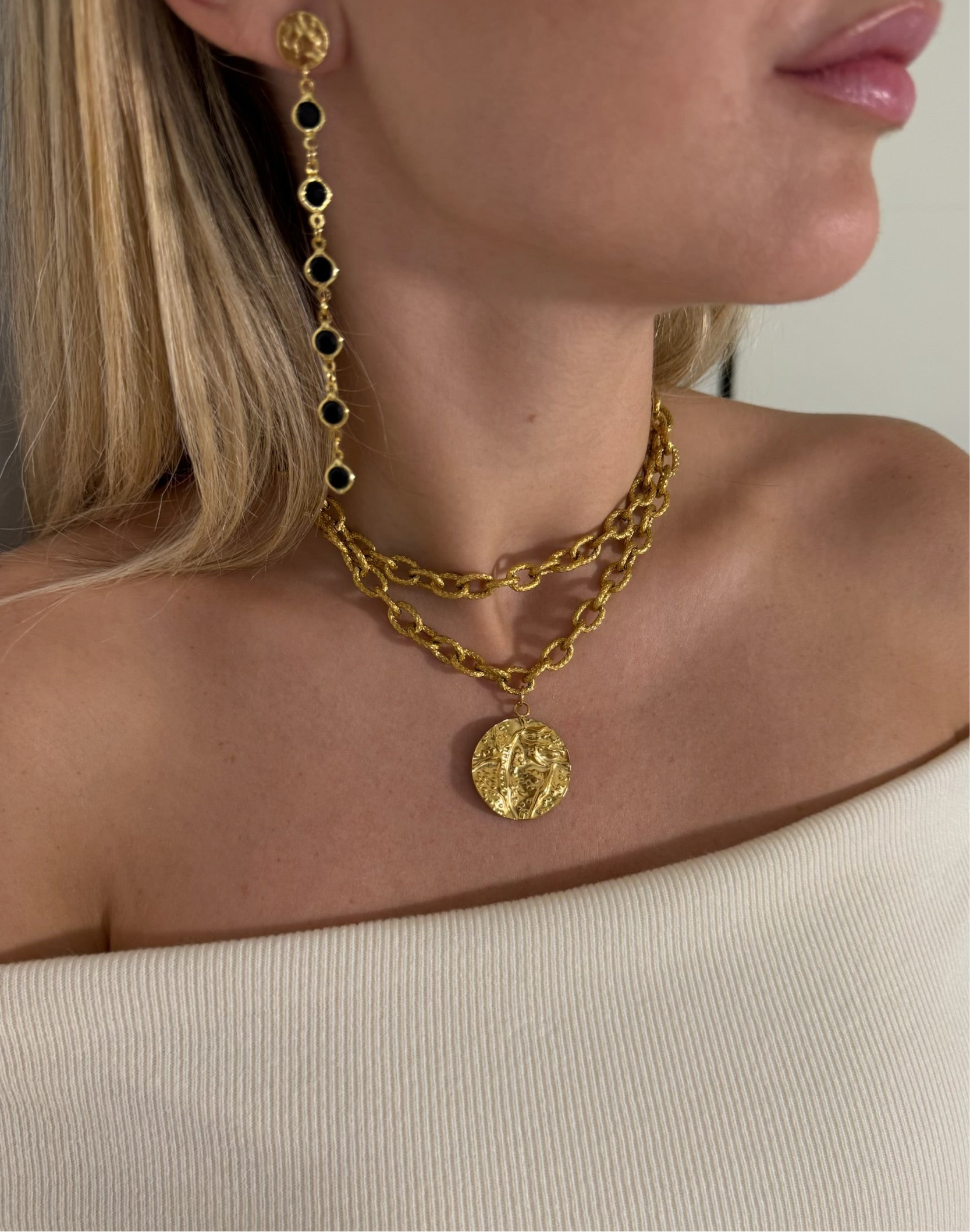 Pendientes dorados con piedras negras que destacan por su elegancia y estilo.